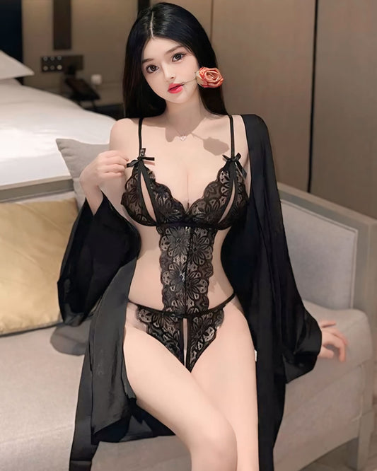 บอดี้สูทลูกไม้ดำพร้อมเสื้อคลุมซาติน